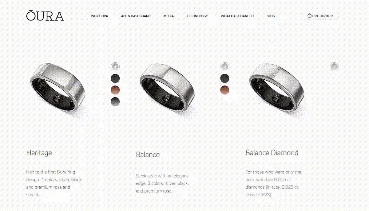 Ouralle luomassamme markkinointisivustossa korostimme visuaalisesti uutta, upeaa designia. Itse sivusto on staattinen ja sisällöltään helposti päivitettävä. Sen HTML-koodi on generoitu ja kopioitu kymmenille palvelimille ympäri maailmaa, jolloin sivusto https://ouraring.com latautuu aina vierailijaa lähinnä olevalta palvelimelta. Kun tuote julkistettiin Slushissa, ei verkkosivuilla havaittu minkäänlaisia ongelmia. Tämänkään jälkeen sivusto ei ole kertaakaan kaatunut vaan se on toiminut aina täysin moitteettomasti ja latautunut todella, todella nopeasti.