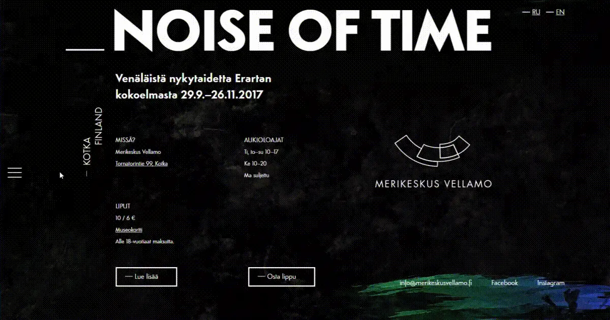 Noise of Time -näyttelyn laskeutumissivu pysäyttää miettimään, saa ihmiset kiinnittämään huomiota näyttelyyn ja herättää mielenkiintoa. Käyttäjän pysäyttävä sivu on näyttävä ilmestys. Mikä käyttäjän kannalta tärkeintä, näyttävyyttä ei ole tehty nopeuden kustannuksella vaan ländäristä on tehty sekä nopea että designiltaan tyylikäs kokonaisuus.